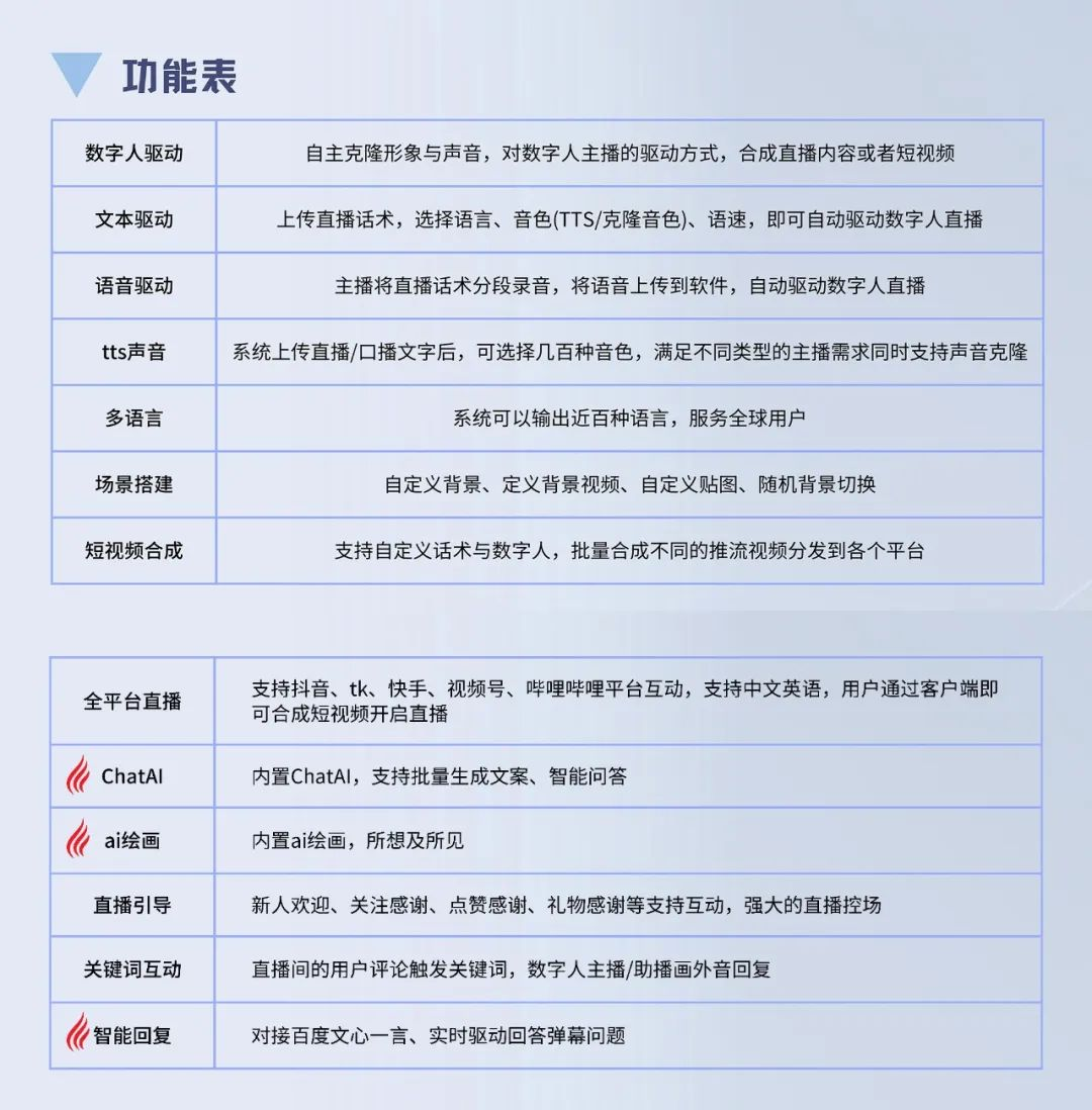 A:可以通过关键词实时语音回复用户问题。客户端对接文心一言,即使用户提问再奇怪的问题,都能实时流畅回复。同时有欢迎、点赞、送礼的实时互动,可以定时引导用户,如抄底商品,做倒计时下单等等。